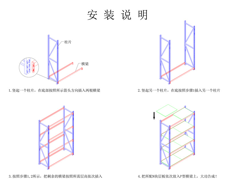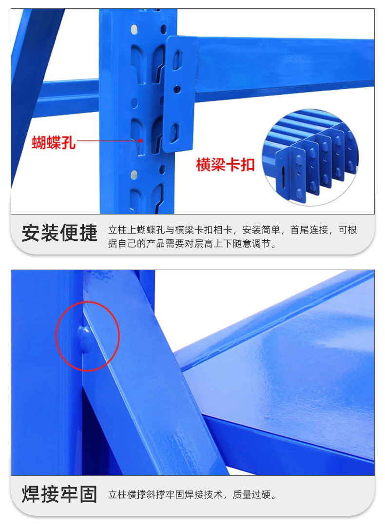 輕型貨架屬于擱板式貨架,承重范圍在100kg到300kg每層,主要是由立柱、斜撐、橫撐、橫梁和層板所組成,其中立柱、斜撐和橫撐可以組成立柱片,輕型貨架的立柱片通常在生產時已經焊接好了,無需后續(xù)組裝。